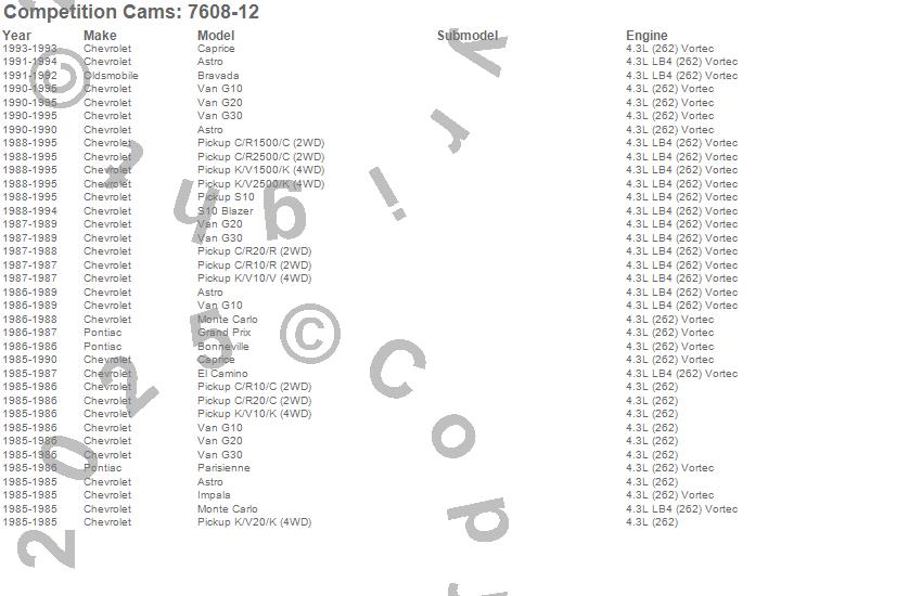 Astro, Bonneville, Bravada, C10 Pickup, C1500 Pickup, C20 Pickup, C2500 Pickup, Caprice, El Camino, G10 Van, G20 Van, G30 Van, Grand Prix, Impala, K10 Pickup, K1500 Pickup, K20 Pickup, K2500 Pickup, Monte Carlo, Parisienne