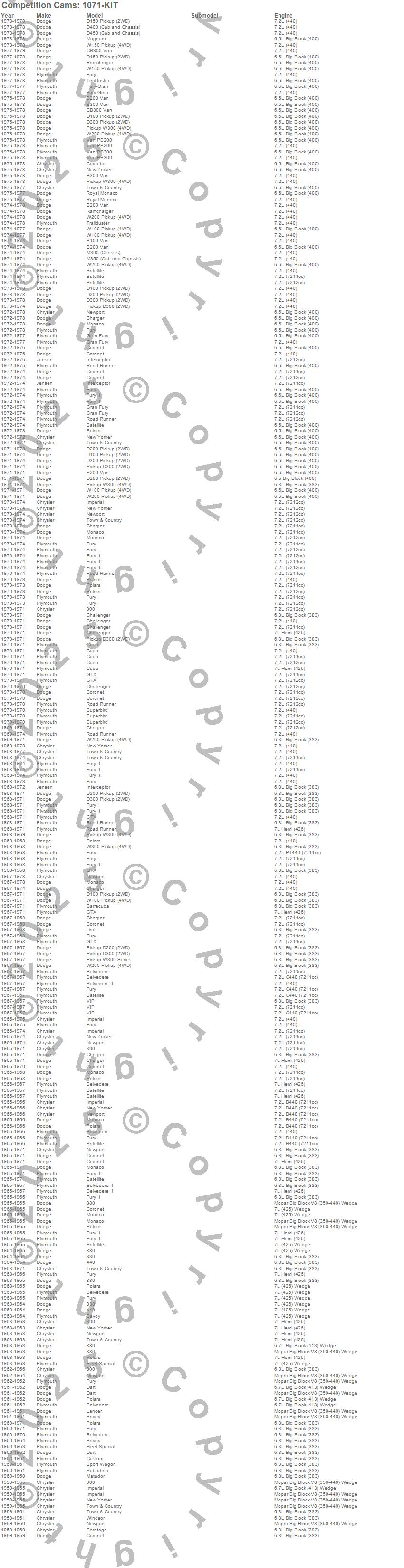 300, 330, 440, 880, B100 Van, B200 Van, B300 Van, Barracuda, Belvedere, Belvedere II, CB300 Van, Challenger, Charger, Cordoba, Coronet, Cuda, Custom, D100 Pickup, D150 Pickup, D200 Pickup