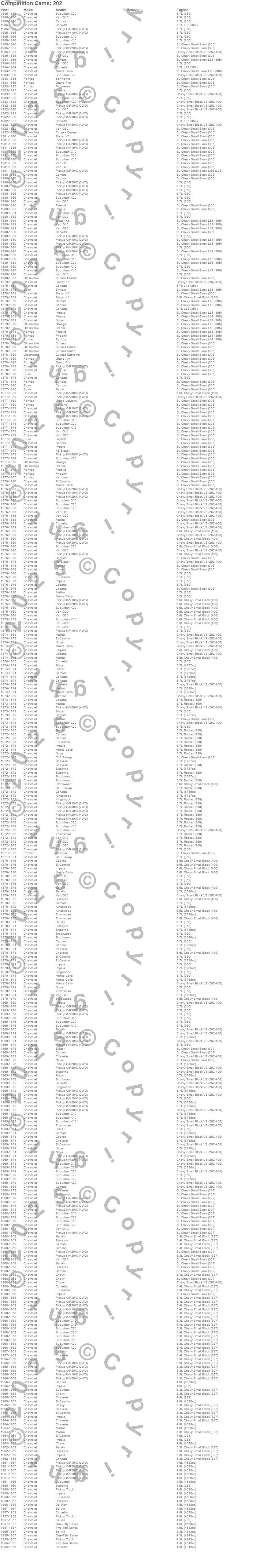 Bel Air, Biscayne, Blazer, Blazer K5, Bonneville, Brookwood, C10 Pickup, C10 Suburban, C20 Pickup, C20 Suburban, C30 Pickup, Camaro, Caprice, Century, Chevelle, Chevy II, Corvette, Cutlass, Cutlass Calais, Cutlass Cruiser