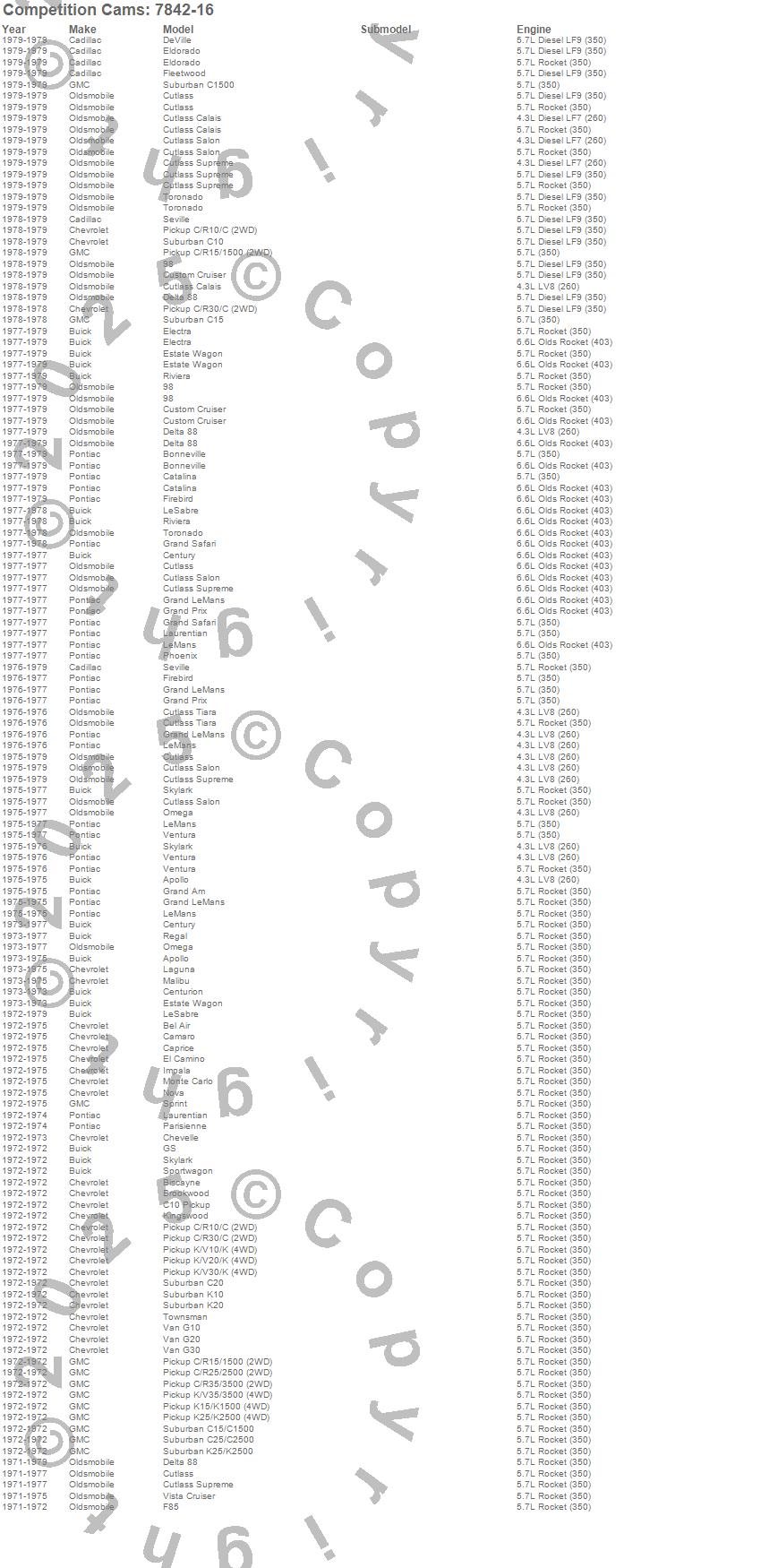 442, 98, Apollo, Bel Air, Bonneville, Brougham, Camaro, Caprice, Catalina, Centurion, Century, Chevelle, Corvette, Custom Cruiser, Cutlass, Cutlass Calais, Cutlass Cruiser, Cutlass Salon, Cutlass Supreme, Cutlass Tiara