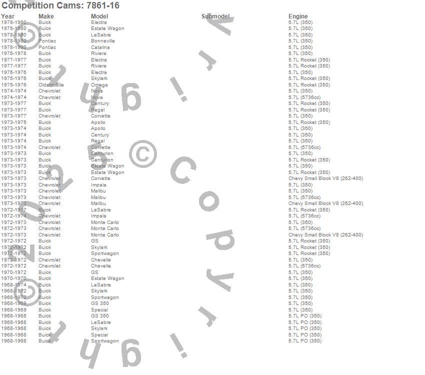 Apollo, Bonneville, Catalina, Centurion, Century, Chevelle, Corvette, Electra, Estate Wagon, GS, GS 350, Impala, LeSabre, Malibu, Monte Carlo, Nova, Omega, Regal, Riviera, Skylark