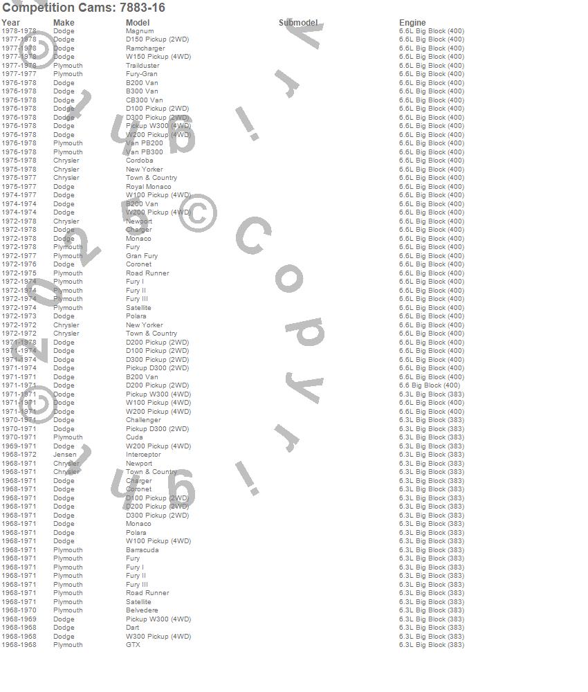 B200 Van, B300 Van, Barracuda, Belvedere, Belvedere II, CB300 Van, Challenger, Charger, Cordoba, Coronet, Cuda, D100 Pickup, D150 Pickup, D200 Pickup, D200 Series, D300 Pickup, Dart, Fury, Fury I, Fury II