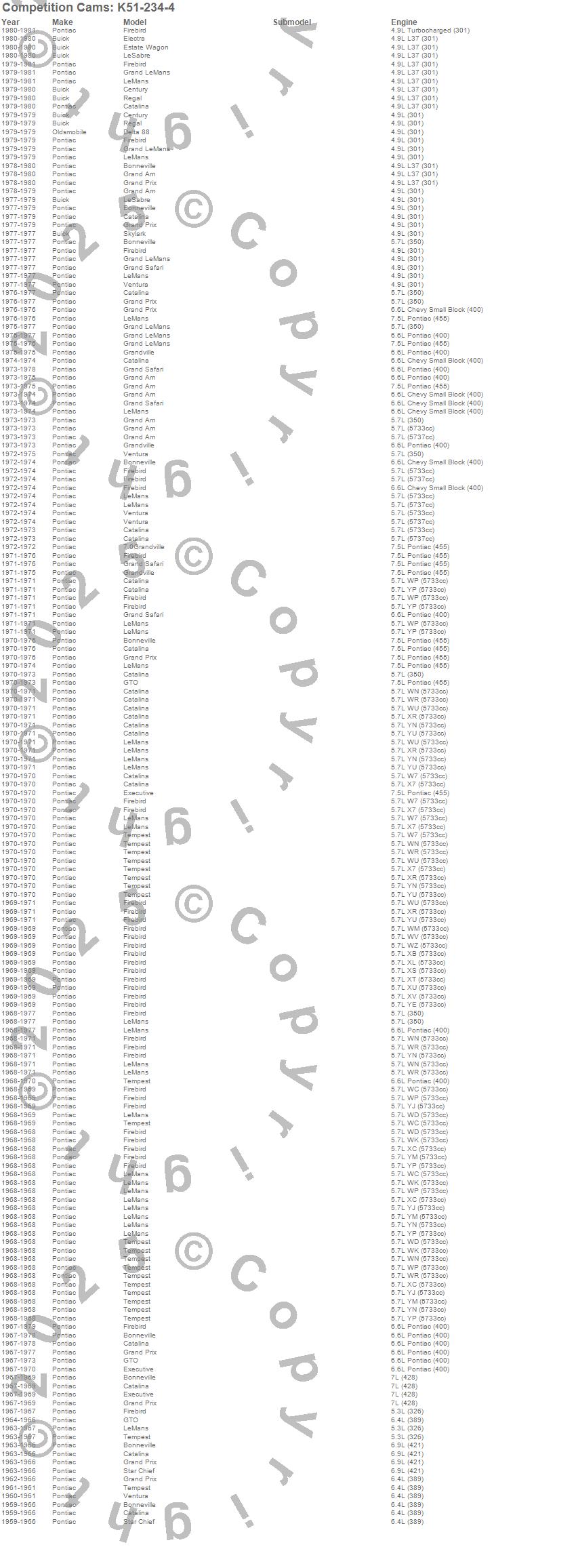 Bonneville, Catalina, Catalina Ventura, Century, Delta 88, Electra, Estate Wagon, Executive, Firebird, Firebird Trans Am, Grand Am, Grand LeMans, Grand Prix, Grand Safari, Grandville, GTO, LeMans, LeSabre, Regal, Safari