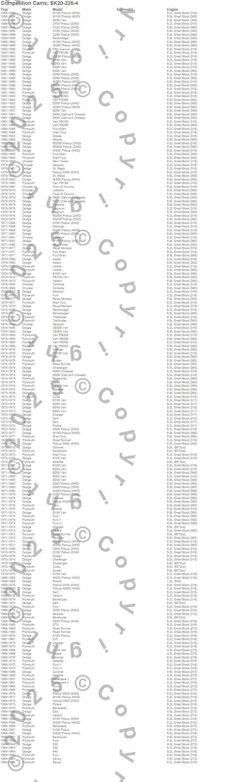 330, 440, 880, A100 Van, Aspen, B100 Van, B150 Van, B200 Van, B250 Van, B300 Van, B350 Van, Barracuda, Belvedere, Belvedere II, CB300 Van, Challenger, Charger, Cordoba, Coronet, Cuda