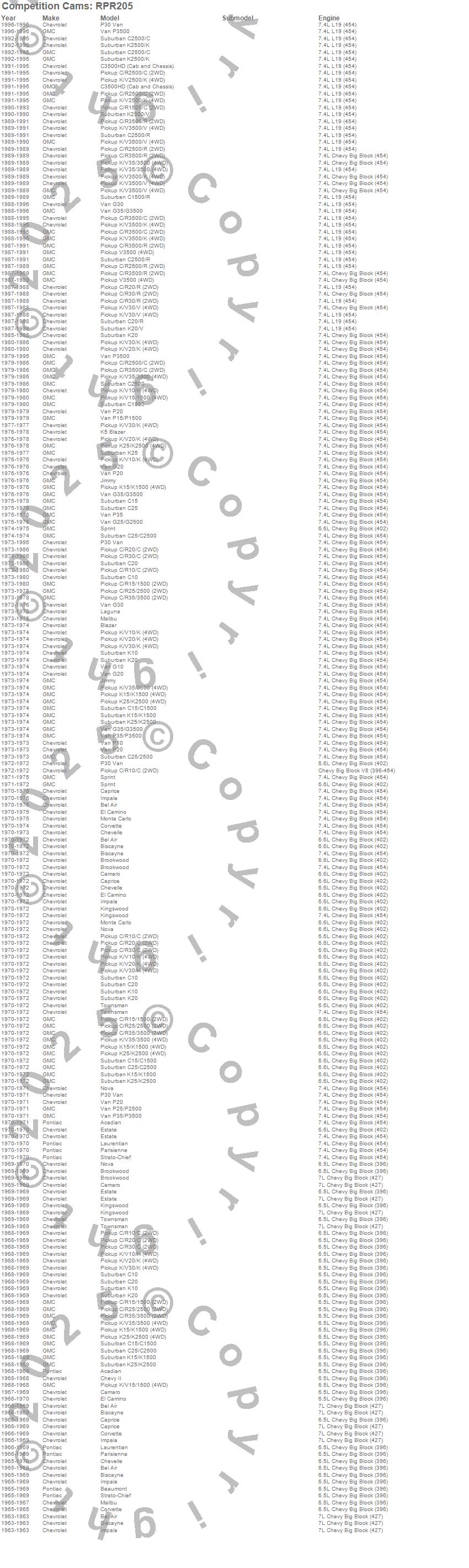 Acadian, Beaumont, Bel Air, Biscayne, Blazer, Blazer K5, Brookwood, C10 Pickup, C10 Suburban, C15 Suburban, C15/C1500 Suburban, C1500 Pickup, C1500 Suburban, C20 Pickup, C20 Suburban, C25 Suburban, C25/C2500 Pickup, C25/C2500 Suburban, C2500 Pickup, C2500 Suburban