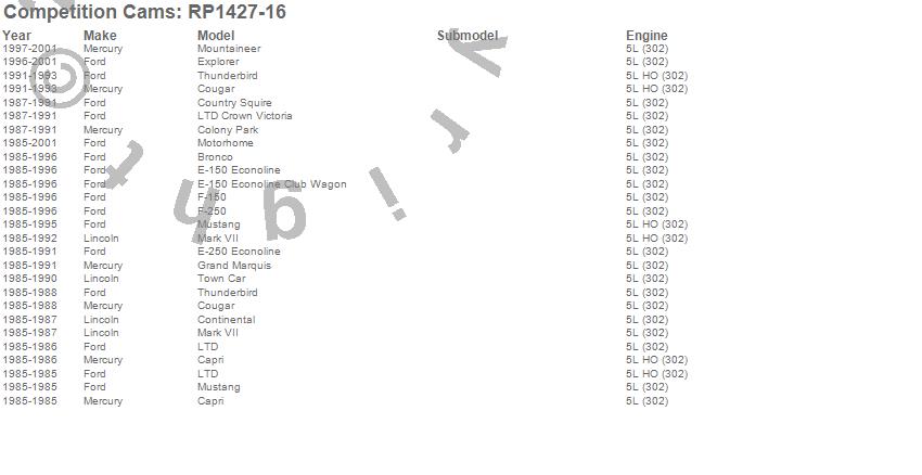 Bronco, Capri, Colony Park, Continental, Cougar, Country Squire, E-150 Econoline, E-150 Econoline Club Wagon, E-250 Econoline, Explorer, F-150, F-250, Grand Marquis, LTD, LTD Crown Victoria, Mark VII, Marquis, Motorhome, Mountaineer, Mustang