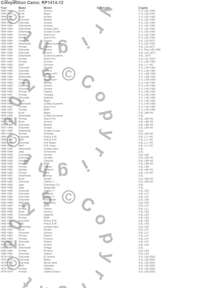 6000, Achieva, Beretta, Caballero, Camaro, Cavalier, Celebrity, Century, Cherokee (XJ), Cimarron, Citation, Citation II, Comanche, Corsica, Cutlass Ciera, Cutlass Cruiser, Cutlass Supreme, El Camino, Fiero, Firebird