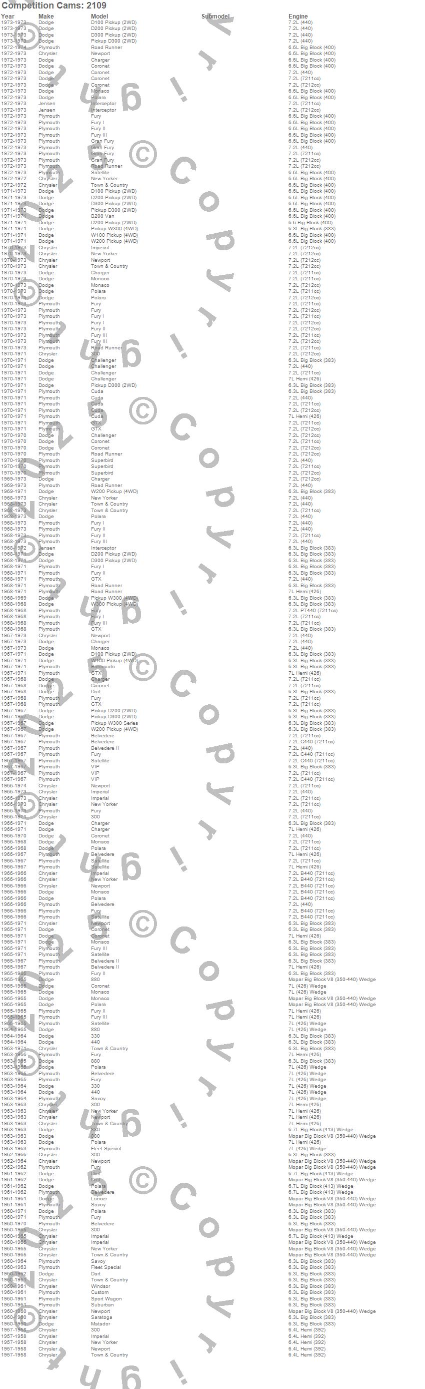 300, 330, 440, 880, B200 Van, Barracuda, Belvedere, Belvedere II, Challenger, Charger, Coronet, Cuda, Custom, D100 Pickup, D200 Pickup, D200 Series, D300 Pickup, Dart, Fleet Special, Fury