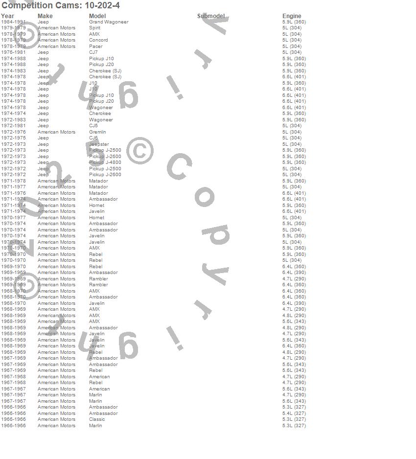 Ambassador, American, AMX, Cherokee (SJ), CJ5, CJ6, CJ7, Classic, Concord, DJ5C, Grand Wagoneer, Gremlin, Hornet, J-2500, J-2600, J-4800, J10, J20, Javelin, Jeepster