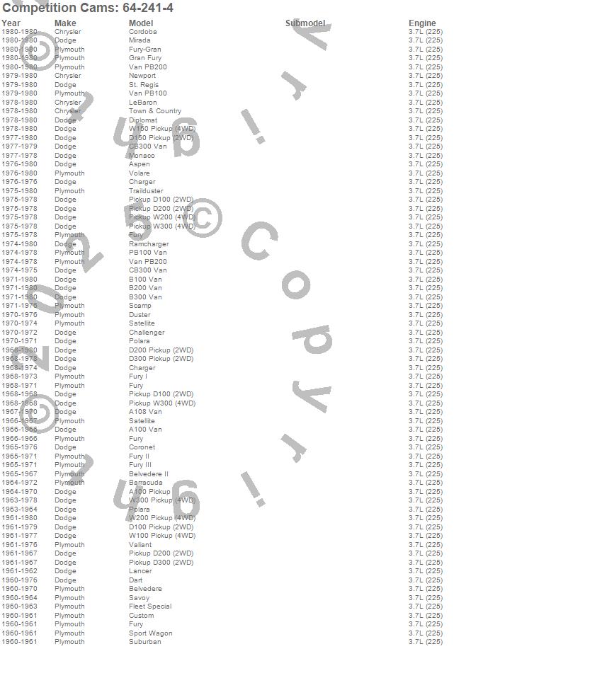A100 Van, A108 Van, Aspen, B100 Van, B200 Van, B300 Van, Barracuda, Belvedere, Belvedere II, CB300 Van, Challenger, Charger, Cordoba, Coronet, Custom, D100 Pickup, D150 Pickup, D200 Pickup, D200 Series, D300 Pickup