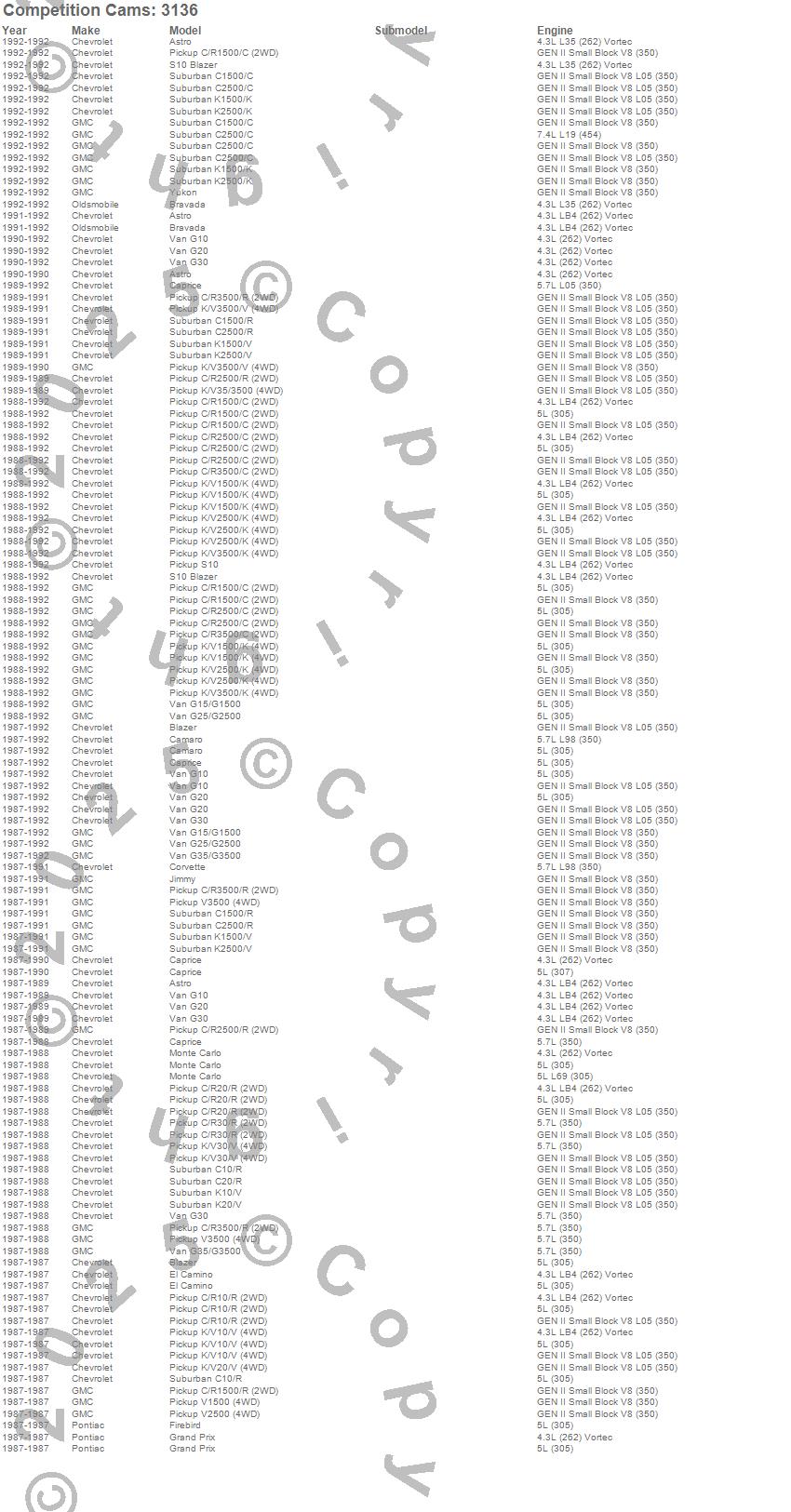 Astro, Blazer, Bravada, C1500 Pickup, C1500 Suburban, C2500 Pickup, C2500 Suburban, C3500 Pickup, Camaro, Caprice, Corvette, El Camino, Firebird, G10 Van, G15/G1500 Van, G20 Van, G25/G2500 Van, G30 Van, G35/G3500 Van, Grand Prix