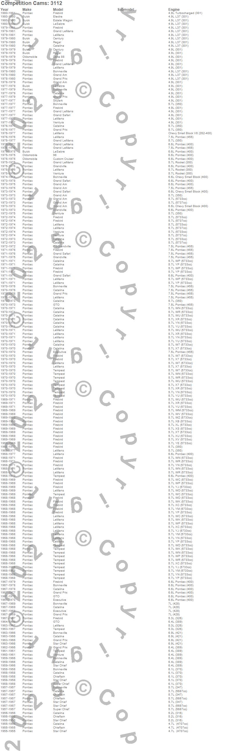 98, Bonneville, Catalina, Catalina Ventura, Century, Chieftain, Custom Cruiser, Delta 88, Electra, Estate Wagon, Executive, Firebird, Firebird Trans Am, Grand Am, Grand LeMans, Grand Prix, Grand Safari, Grandville, GTO, LeMans