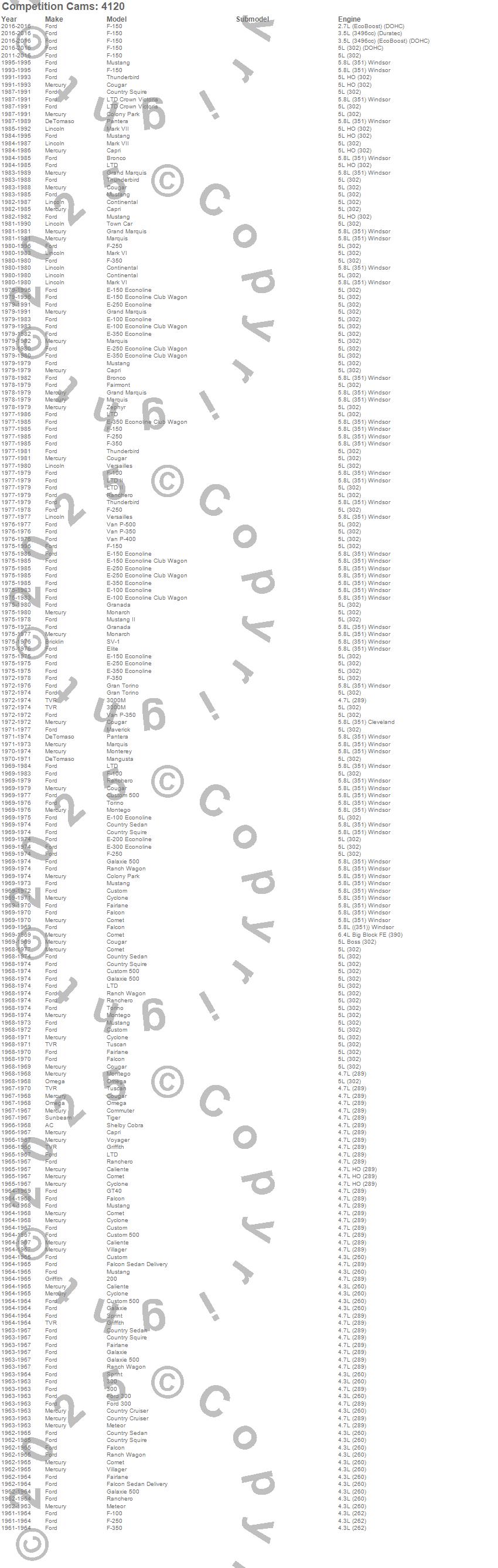 200, 3000M, Bronco, Caliente, Capri, Club, Club Cargo, Club Wagon, Colony Park, Comet, Commuter, Continental, Cougar, Country Cruiser, Country Sedan, Country Squire, Custom, Custom 500, Cyclone, E-100 Econoline