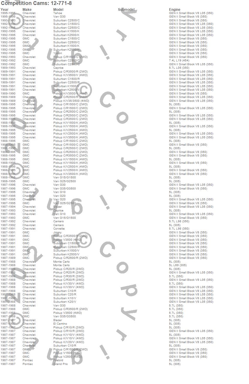 Blazer, C1500 Pickup, C1500 Suburban, C2500 Pickup, C2500 Suburban, C3500 Pickup, Camaro, Caprice, Corvette, El Camino, Firebird, G10 Van, G15/G1500 Van, G20 Van, G25/G2500 Van, G30 Van, G35/G3500 Van, Grand Prix, Jimmy, K1500