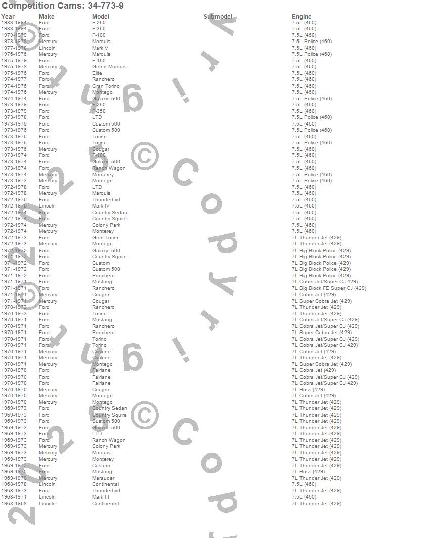 Colony Park, Continental, Cougar, Country Sedan, Country Squire, Custom, Custom 500, Cyclone, Elite, F-100, F-150, F-250, F-350, Fairlane, Galaxie 500, Gran Torino, Grand Marquis, LTD, Marauder, Mark III