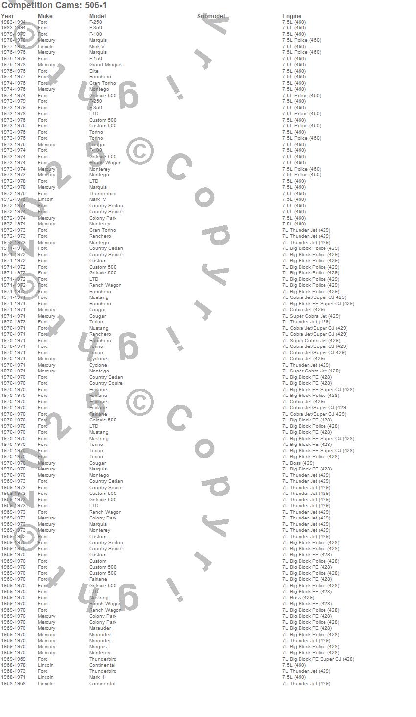 Colony Park, Continental, Cougar, Country Sedan, Country Squire, Custom, Custom 500, Cyclone, Elite, F-100, F-150, F-250, F-350, Fairlane, Galaxie 500, Gran Torino, Grand Marquis, LTD, Marauder, Mark III
