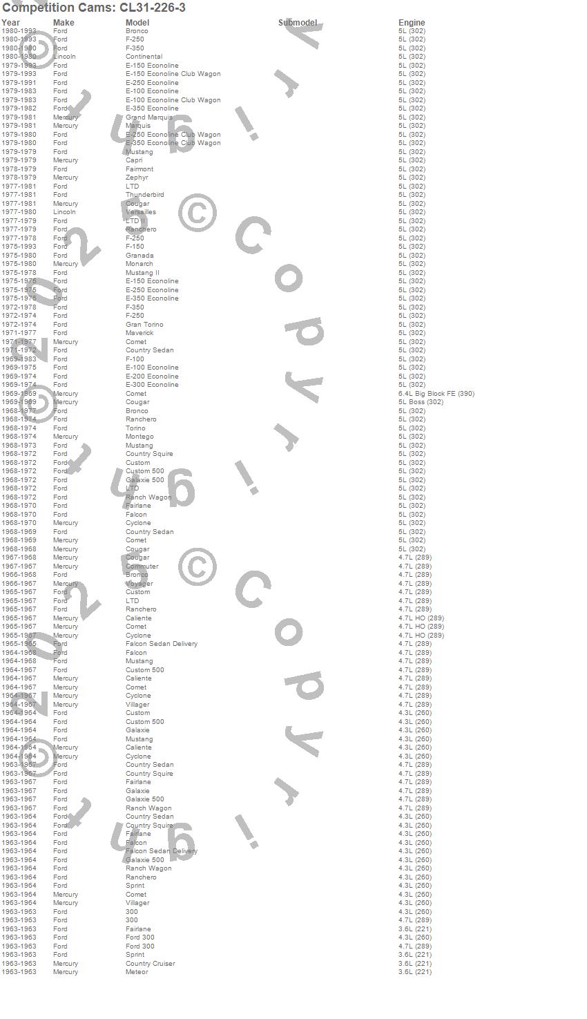 Bronco, Caliente, Capri, Club Cargo, Comet, Commuter, Continental, Cougar, Country Cruiser, Country Sedan, Country Squire, Custom, Custom 500, Cyclone, E-100 Econoline, E-100 Econoline Club Wagon, E-150 Econoline, E-150 Econoline Club Wagon, E-200 Econoline, E-250 Econoline