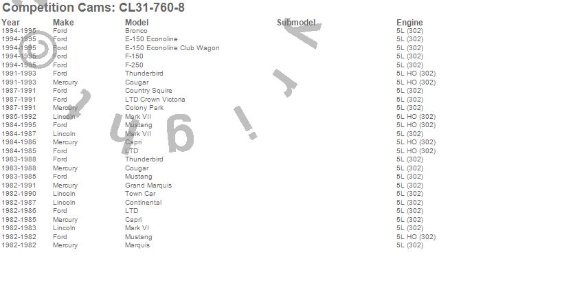 Bronco, Capri, Colony Park, Continental, Cougar, Country Squire, E-150 Econoline, E-150 Econoline Club Wagon, F-150, F-250, Grand Marquis, LTD, LTD Crown Victoria, Mark VI, Mark VII, Marquis, Mustang, Thunderbird, Town Car, Ford