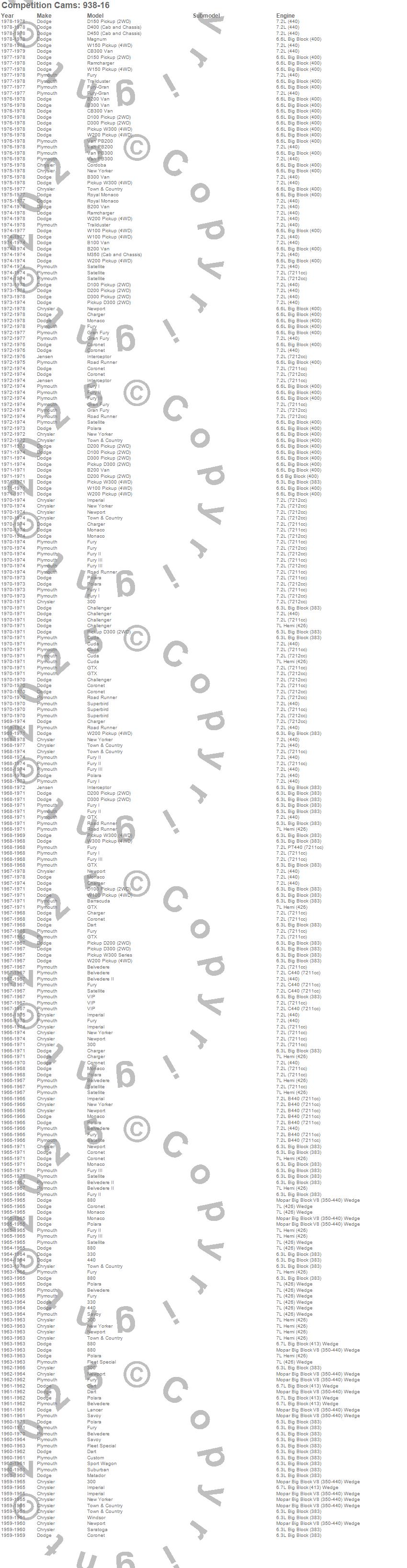 300, 330, 440, 880, B100 Van, B200 Van, B300 Van, Barracuda, Belvedere, Belvedere II, CB300 Van, Challenger, Charger, Cordoba, Coronet, Cuda, Custom, D100 Pickup, D150 Pickup, D200 Pickup