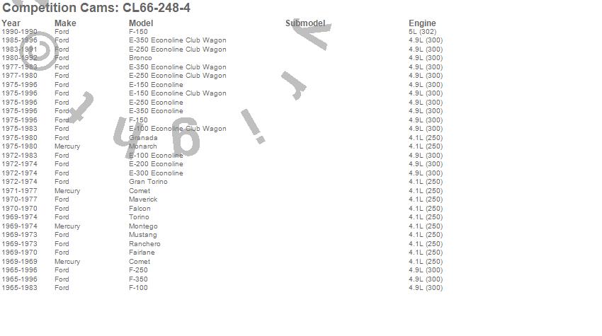 Bronco, Comet, E-100 Econoline, E-100 Econoline Club Wagon, E-150 Econoline, E-150 Econoline Club Wagon, E-200 Econoline, E-250 Econoline, E-250 Econoline Club Wagon, E-300 Econoline, E-350 Econoline, E-350 Econoline Club Wagon, F-100, F-150, F-250, F-250 HD, F-350, Fairlane, Falcon, Gran Torino