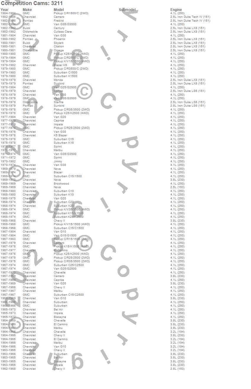 Bel Air, Biscayne, Blazer, Blazer K5, Brookwood, C10 Suburban, C15 Suburban, C15/C1500 Suburban, C1500 Pickup, C1500 Suburban, C20 Suburban, C25/C2500 Pickup, C25/C2500 Suburban, C2500 Pickup, C35/C3500 Pickup, C3500 Pickup, Camaro, Caprice, Century, Chevelle
