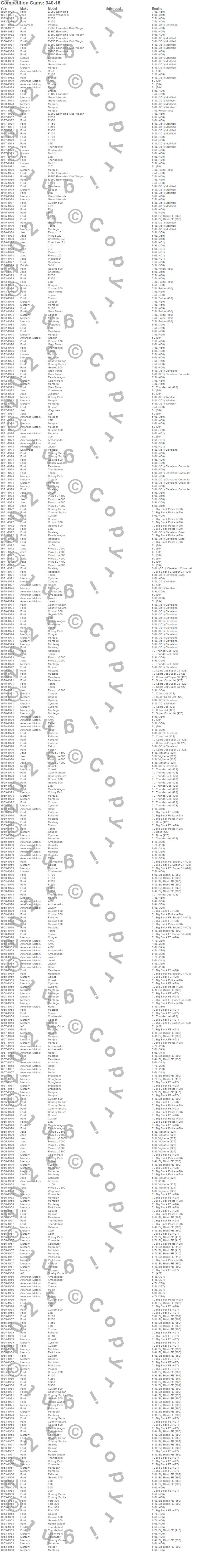 Ambassador, American, AMX, Breezeway, Bronco, Brougham, Caliente, Cherokee (SJ), CJ5, CJ6, CJ7, Classic, Colony Park, Comet, Commuter, Concord, Continental, Cougar, Country Sedan, Country Squire