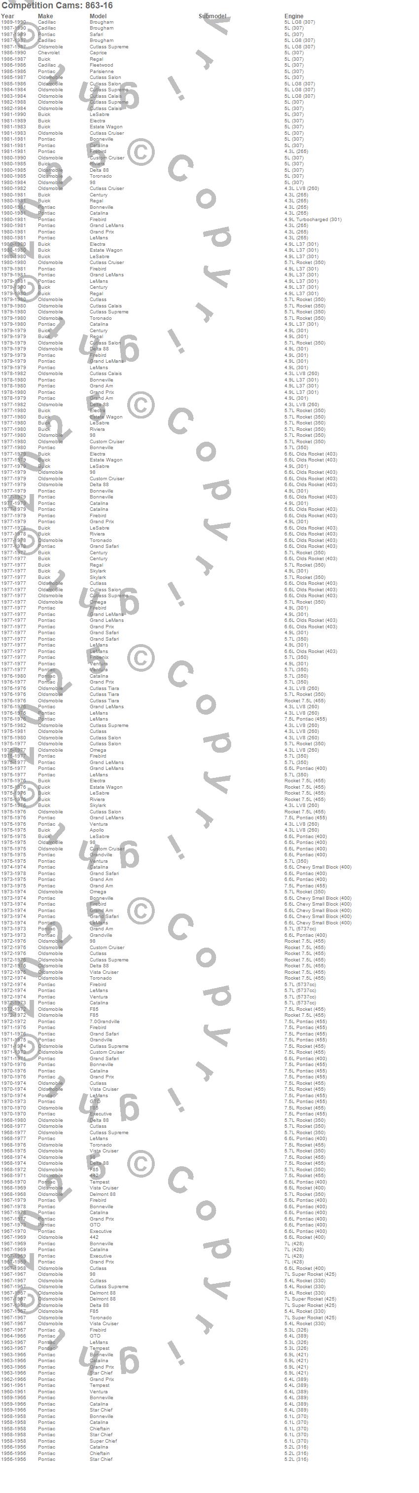 442, 98, Apollo, Bonneville, Brougham, Caprice, Catalina, Catalina Ventura, Centurion, Century, Chieftain, Custom Cruiser, Cutlass, Cutlass Calais, Cutlass Cruiser, Cutlass Salon, Cutlass Supreme, Cutlass Tiara, Delmont 88, Delta 88
