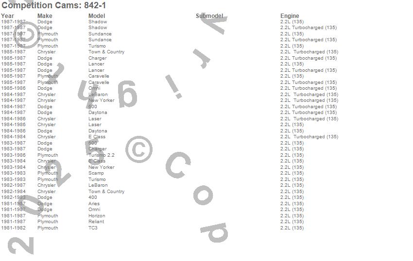 400, 600, Aries, Caravelle, Charger, Daytona, E Class, Executive Limousine, Horizon, Lancer, Laser, LeBaron, New Yorker, Omni, Reliant, Scamp, Shadow, Sundance, TC3, Town & Country