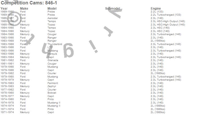 Aerostar, Bobcat, Capri, Cougar, Courier, Fairmont, Granada, LTD, Marquis, Mustang, Mustang II, Pinto, Probe, Ranger, Tempo, Thunderbird, Topaz, Zephyr, Ford, Mercury