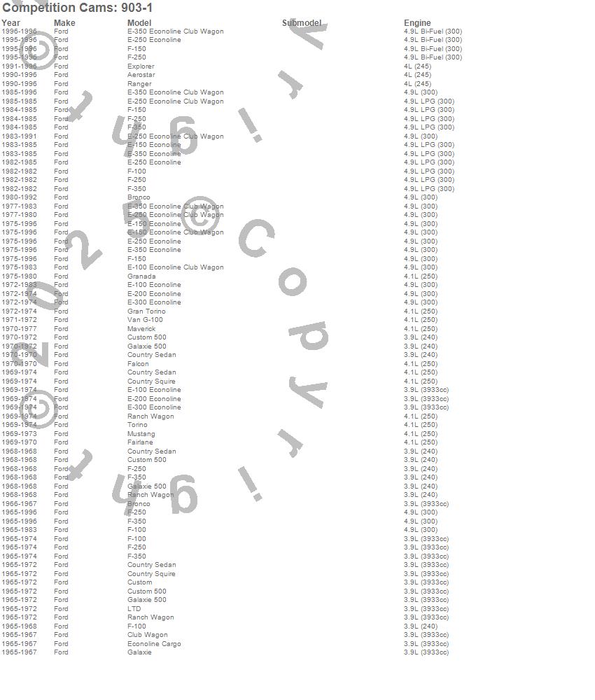 Bronco, Comet, E-100 Econoline, E-100 Econoline Club Wagon, E-150 Econoline, E-150 Econoline Club Wagon, E-200 Econoline, E-250 Econoline, E-250 Econoline Club Wagon, E-300 Econoline, E-350 Econoline, E-350 Econoline Club Wagon, F-100, F-150, F-250, F-250 HD, F-350, Fairlane, Falcon, Gran Torino
