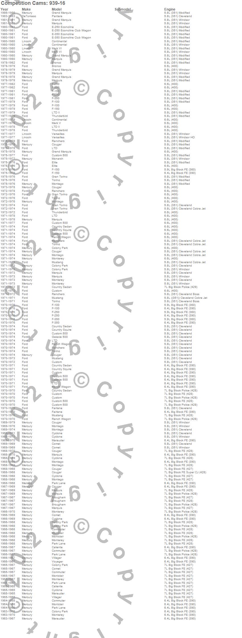 Breezeway, Bronco, Brougham, C2500 Pickup, C2500 Suburban, C3500 Pickup, Caliente, Colony Park, Comet, Commuter, Continental, Cougar, Country Sedan, Country Squire, Custom, Custom 500, Cyclone, E-100 Econoline, E-100 Econoline Club Wagon, E-150 Econoline