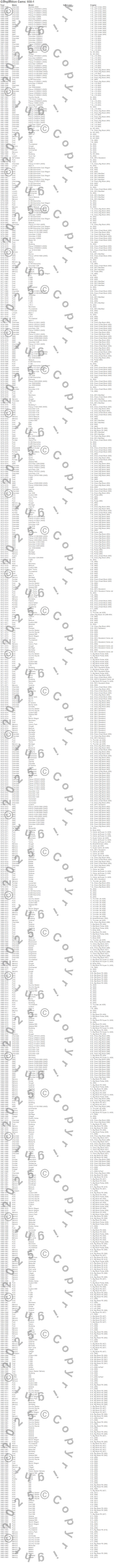 Bel Air, Biscayne, Blazer, Blazer K5, Breezeway, Bronco, Brookwood, Brougham, C10 Pickup, C10 Suburban, C15 Suburban, C15/C1500 Suburban, C1500 Pickup, C1500 Suburban, C20 Pickup, C20 Suburban, C25 Suburban, C25/C2500 Pickup, C25/C2500 Suburban, C2500 Pickup
