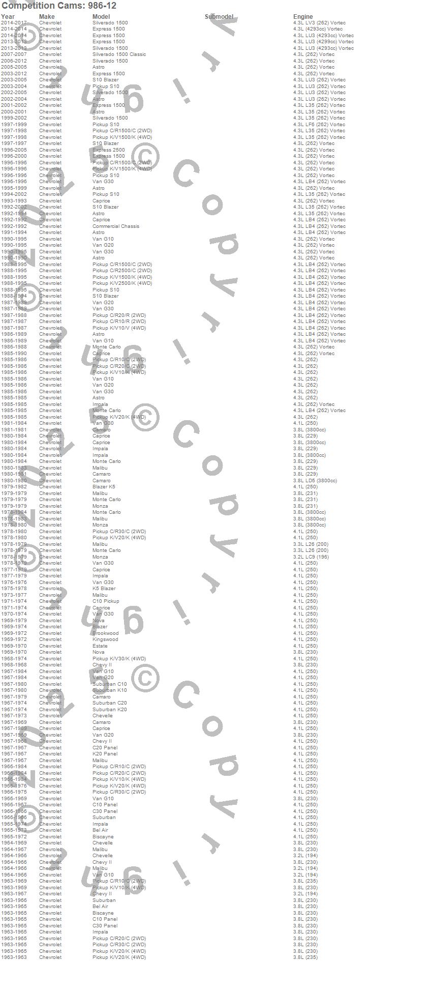 Astro, Bel Air, Biscayne, Blazer, Blazer K5, Bravada, Brookwood, C10 Suburban, C15 Suburban, C15/C1500 Suburban, C1500 Pickup, C1500 Suburban, C20 Suburban, C25/C2500 Pickup, C25/C2500 Suburban, C2500 Pickup, C35/C3500 Pickup, C3500 Pickup, Camaro, Caprice