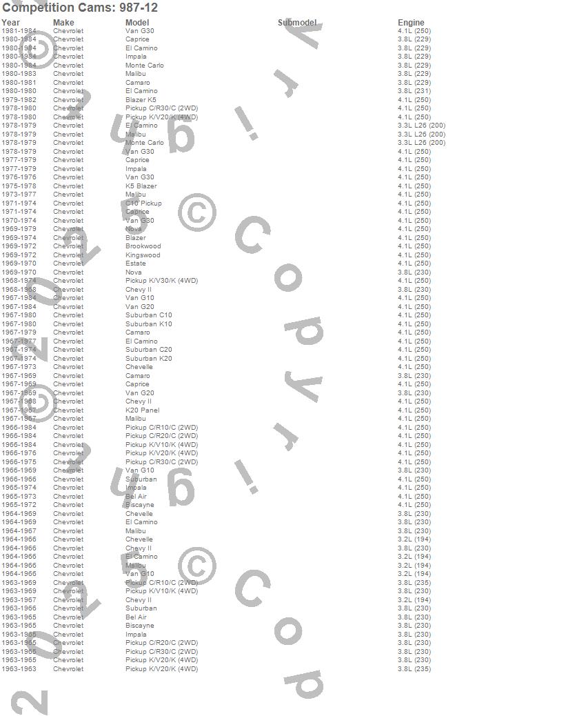 Astro, Bravada, C1500 Pickup, C2500 Pickup, Caprice, El Camino, Express 1500, Express 2500, G10 Van, G20 Van, G30 Van, Grand Prix, K1500 Pickup, K2500 Pickup, Monte Carlo, R10 Pickup, R20 Pickup, S10 Blazer, S10 Blazer (Canadian), S10 Pickup