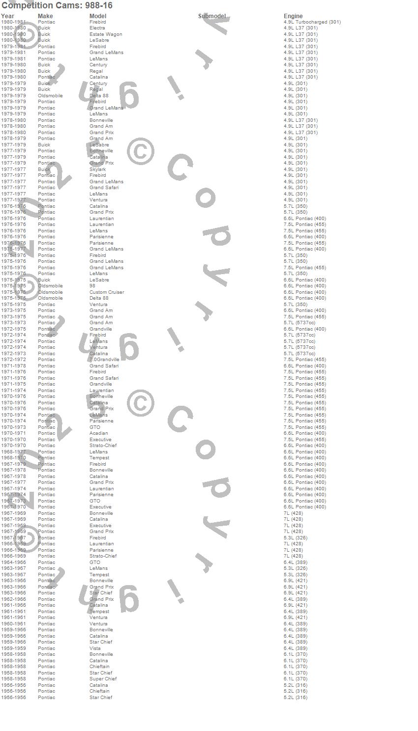 Bonneville, Catalina, Catalina Ventura, Century, Delta 88, Electra, Estate Wagon, Executive, Firebird, Firebird Trans Am, Grand Am, Grand LeMans, Grand Prix, Grand Safari, Grandville, GTO, LeMans, LeSabre, Regal, Safari