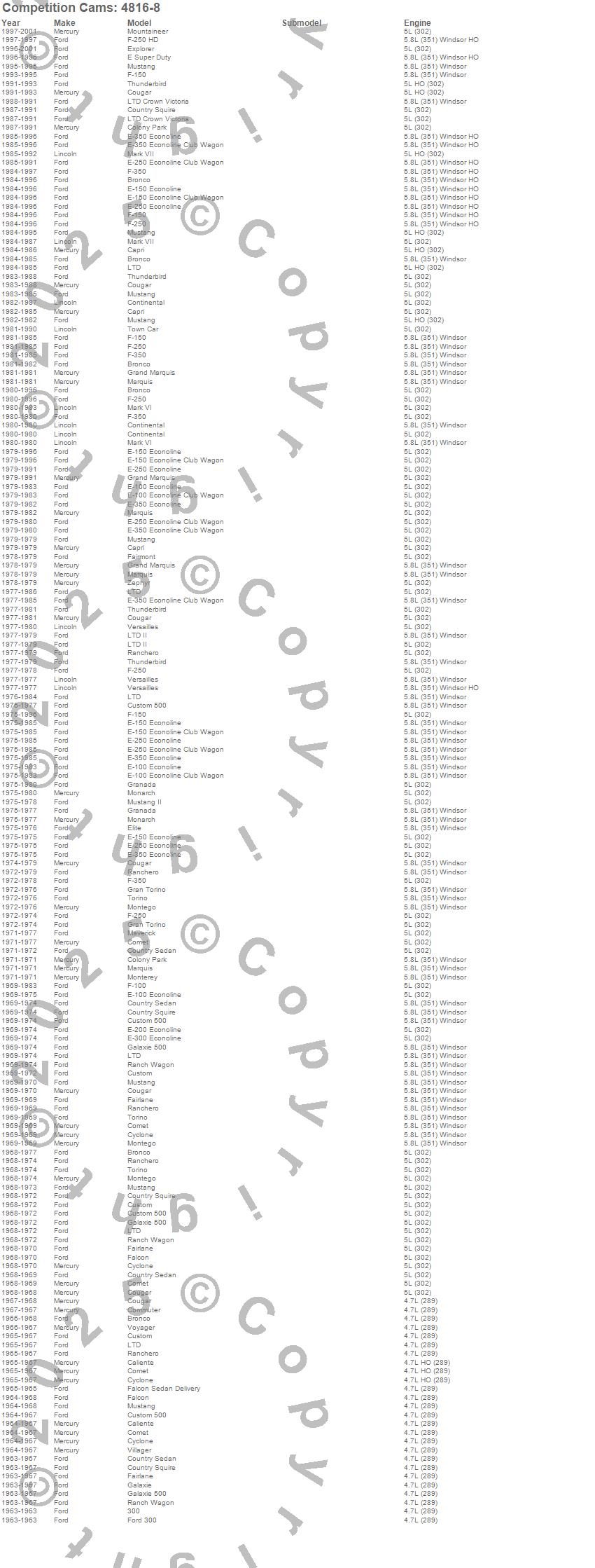 Bronco, Caliente, Capri, Club Cargo, Colony Park, Comet, Commuter, Continental, Cougar, Country Sedan, Country Squire, Custom, Custom 500, Cyclone, E Super Duty, E-100 Econoline, E-100 Econoline Club Wagon, E-150 Econoline, E-150 Econoline Club Wagon, E-200 Econoline