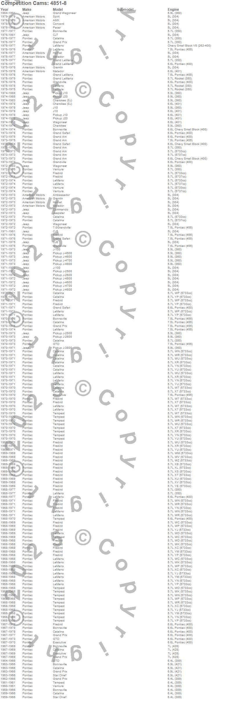 Ambassador, AMX, Bonneville, Catalina, Catalina Ventura, Cherokee (SJ), CJ5, CJ6, CJ7, Commando, Concord, DJ5, DJ5C, Executive, Firebird, Firebird Trans Am, Grand Am, Grand LeMans, Grand Prix, Grand Safari