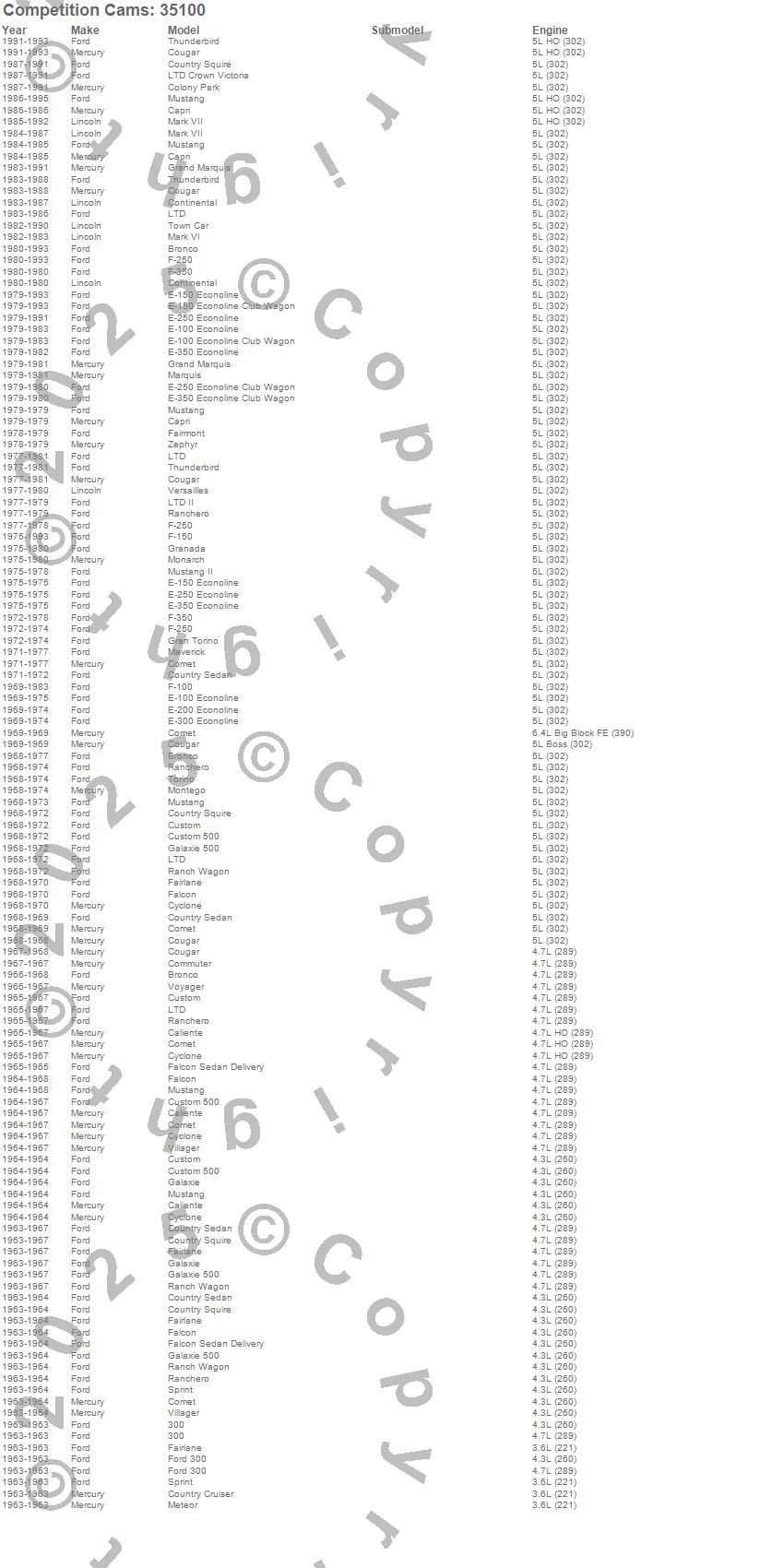 Bronco, Caliente, Capri, Club Cargo, Colony Park, Comet, Commuter, Continental, Cougar, Country Cruiser, Country Sedan, Country Squire, Custom, Custom 500, Cyclone, E-100 Econoline, E-100 Econoline Club Wagon, E-150 Econoline, E-150 Econoline Club Wagon, E-200 Econoline