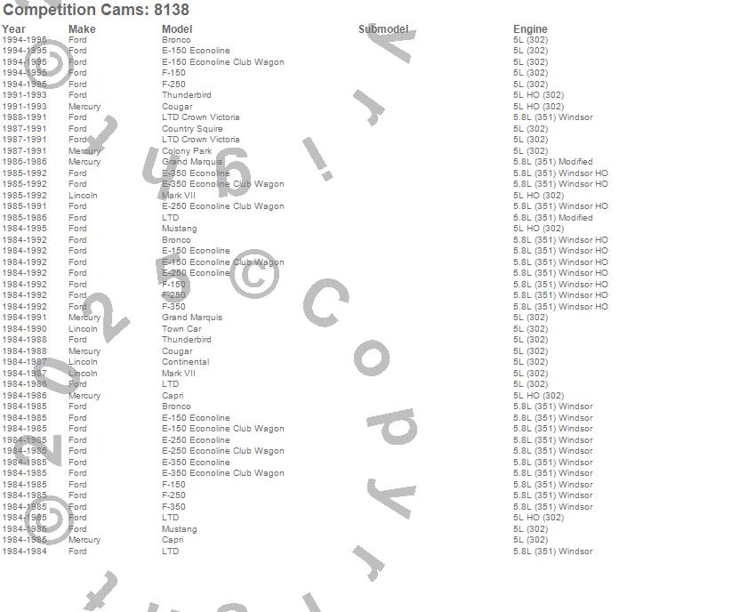 Bronco, Capri, Colony Park, Continental, Cougar, Country Squire, E-150 Econoline, E-150 Econoline Club Wagon, E-250 Econoline, E-250 Econoline Club Wagon, E-350 Econoline, E-350 Econoline Club Wagon, F-150, F-250, F-350, Grand Marquis, LTD, LTD Crown Victoria, Mark VII, Marquis