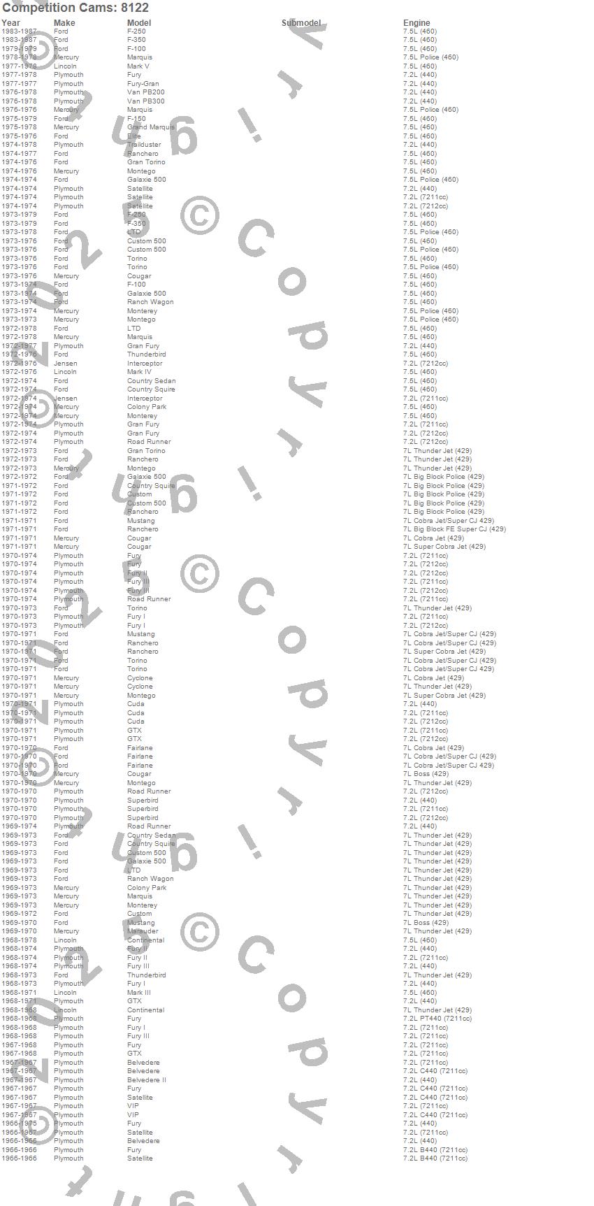 Belvedere, Belvedere II, Colony Park, Continental, Cougar, Country Sedan, Country Squire, Cuda, Custom, Custom 500, Cyclone, Elite, F-100, F-150, F-250, F-350, Fairlane, Fury, Fury I, Fury II