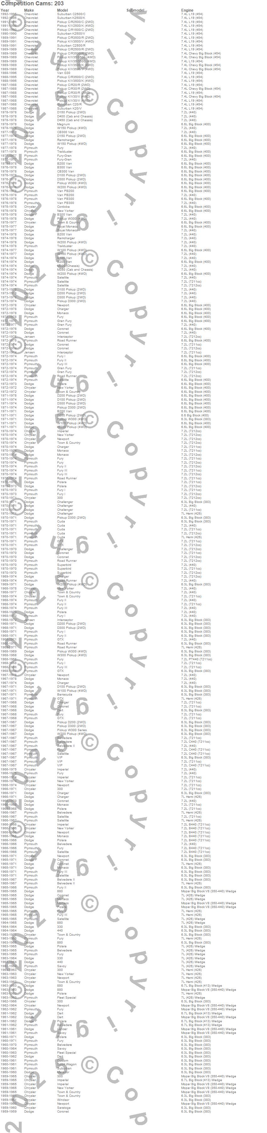 300, 330, 440, 880, B100 Van, B200 Van, B300 Van, Barracuda, Belvedere, Belvedere II, C1500 Pickup, C2500 Pickup, C2500 Suburban, C3500 Pickup, CB300 Van, Challenger, Charger, Cordoba, Coronet, Cuda
