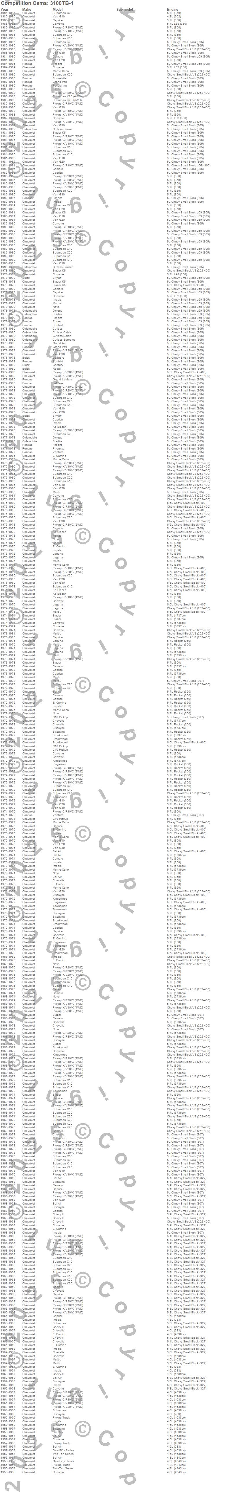 Bel Air, Biscayne, Blazer, Blazer K5, Bonneville, Brookwood, C10 Pickup, C10 Suburban, C20 Pickup, C20 Suburban, C30 Pickup, Camaro, Caprice, Century, Chevelle, Chevy II, Corvette, Cutlass, Cutlass Calais, Cutlass Cruiser