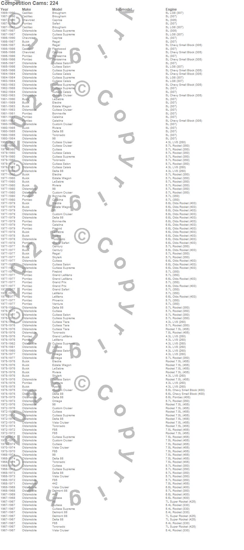 442, 98, Apollo, Bonneville, Brougham, Caprice, Catalina, Century, Custom Cruiser, Cutlass, Cutlass Calais, Cutlass Cruiser, Cutlass Salon, Cutlass Supreme, Cutlass Tiara, Delmont 88, Delta 88, Electra, Estate Wagon, F85