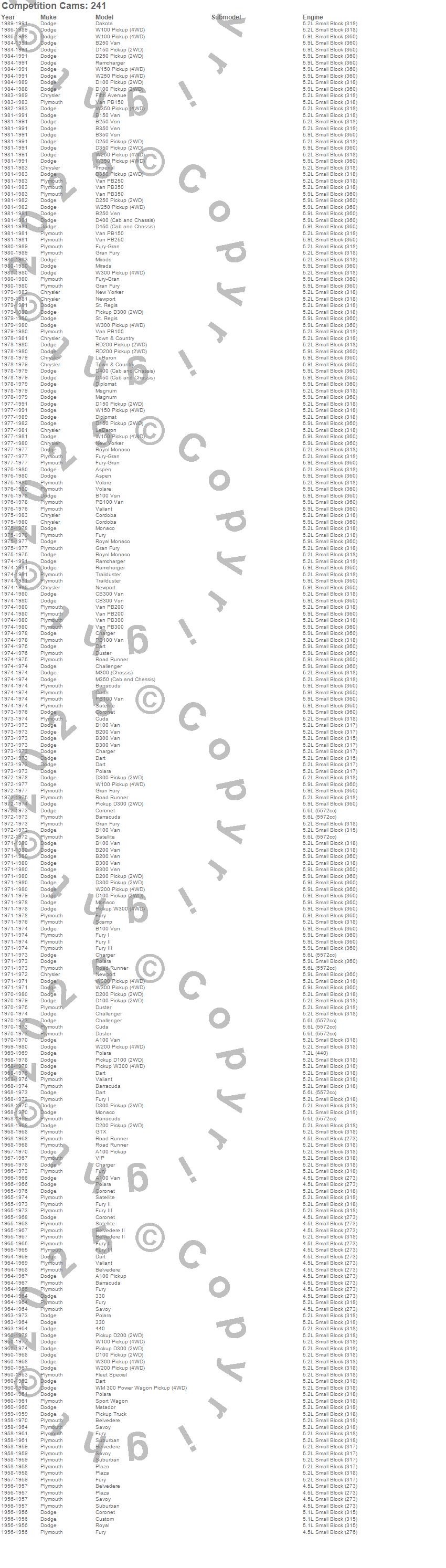 330, 440, 880, A100 Van, Aspen, B100 Van, B150 Van, B200 Van, B250 Van, B300 Van, B350 Van, Barracuda, Belvedere, Belvedere II, CB300 Van, Challenger, Charger, Cordoba, Coronet, Cuda