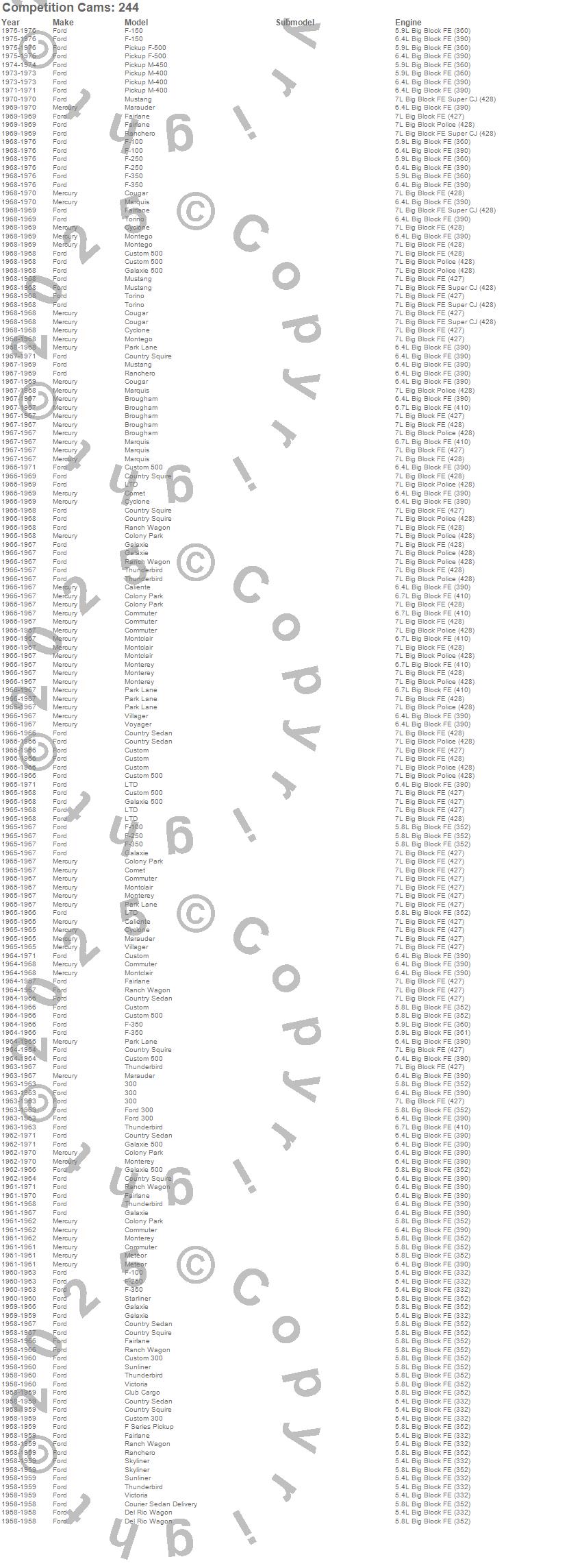 Breezeway, Brougham, Caliente, Club Cargo, Colony Park, Comet, Commuter, Cougar, Country Sedan, Country Squire, Courier Sedan Delivery, Custom, Custom 300, Custom 500, Cyclone, Del Rio Wagon, F Series, F-100, F-150, F-250