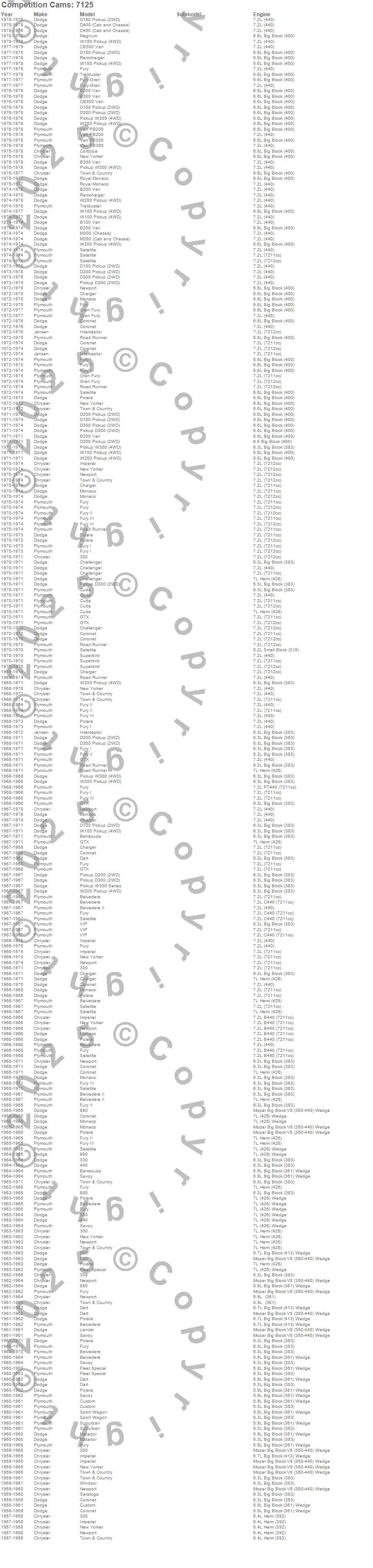 300, 330, 440, 880, B100 Van, B200 Van, B300 Van, Barracuda, Belvedere, Belvedere II, CB300 Van, Challenger, Charger, Cordoba, Coronet, Cuda, Custom, D100 Pickup, D150 Pickup, D200 Pickup