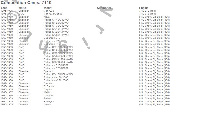 Bel Air, Biscayne, C10 Pickup, C10 Suburban, C15/C1500 Suburban, C1500 Pickup, C20 Pickup, C20 Suburban, C25/C2500 Pickup, C25/C2500 Suburban, C30 Pickup, C35/C3500 Pickup, Camaro, Caprice, Chevelle, Chevy II, El Camino, G30 Van, G35/G3500 Van, Impala