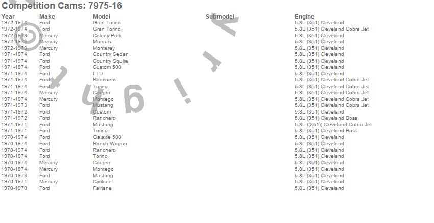 Colony Park, Cougar, Country Sedan, Country Squire, Custom, Custom 500, Cyclone, Fairlane, Galaxie 500, Gran Torino, LTD, Marquis, Montego, Monterey, Mustang, Ranch Wagon, Ranchero, Torino, Ford, Mercury