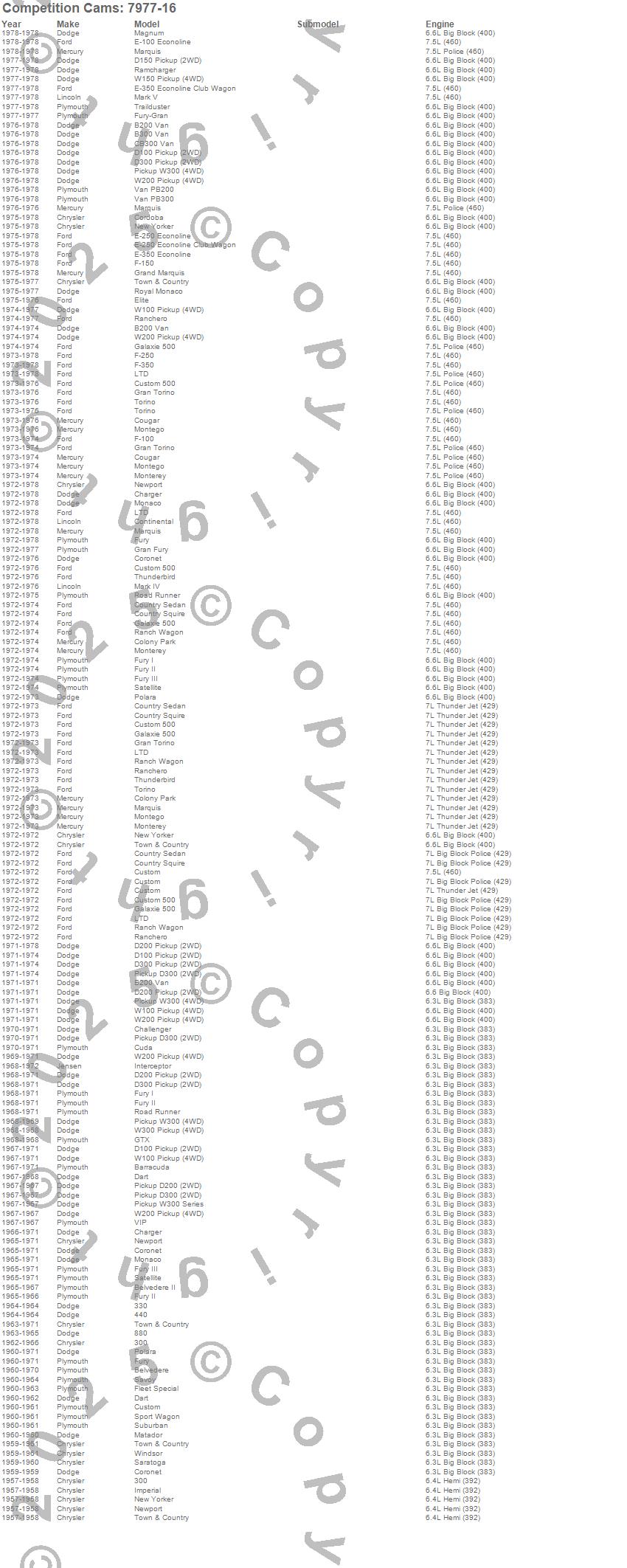 300, 330, 440, 880, B200 Van, B300 Van, Barracuda, Belvedere, Belvedere II, CB300 Van, Challenger, Charger, Cordoba, Coronet, Cuda, Custom, D100 Pickup, D150 Pickup, D200 Pickup, D200 Series