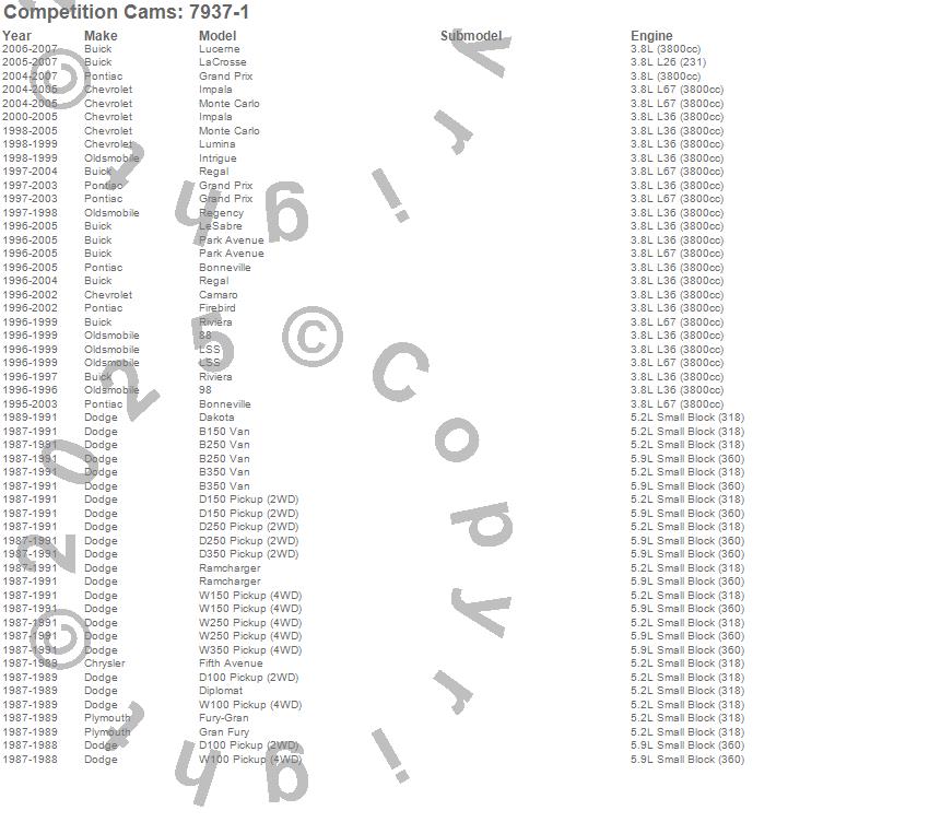 88, 98, B150 Van, B250 Van, B350 Van, Bonneville, Camaro, D100 Pickup, D150 Pickup, D250 Pickup, D350 Pickup, Dakota, Diplomat, Fifth Avenue, Firebird, Gran Fury, Grand Prix, Impala, Intrigue, LaCrosse